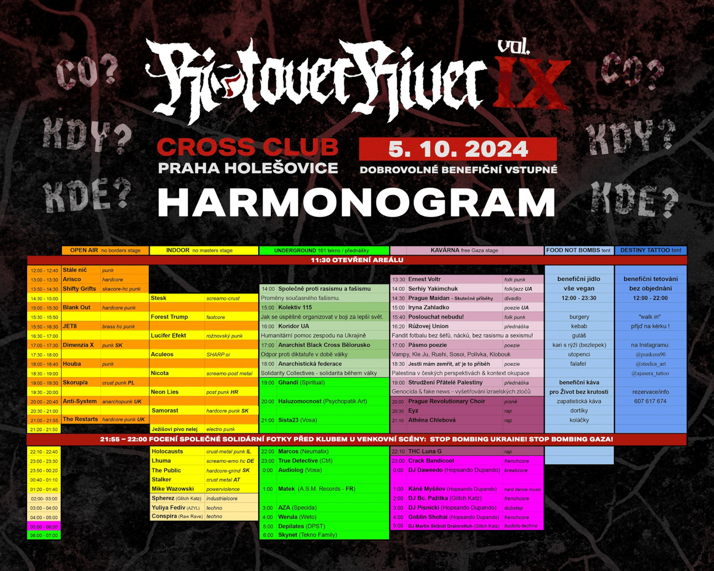 Anarchistická federace se připojuje k pozvánce na tradiční antifašistický festival Riot over River, jenž se již podeváté bude konat v pražských Holešovicích, a to konkrétně v klubu Cross (Plynární 1096/23). Jako vždy jde o benefiční podnik. Vybrané příspěvky po odečtení nákladů poputují na pomoc pro Solidarity Collectives, autonomní kolektivy na Ukrajině, které bojují proti ruskému fašismu a imperialismu jak na frontě, tak v zázemí.