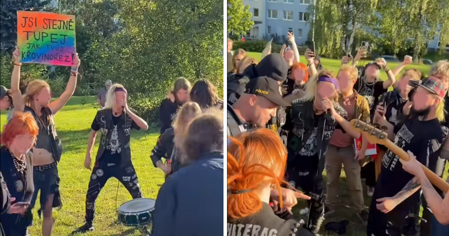 Zpráva o punkovém happeningu protestujícím v Praze proti předvolební akci Okamury a jeho party