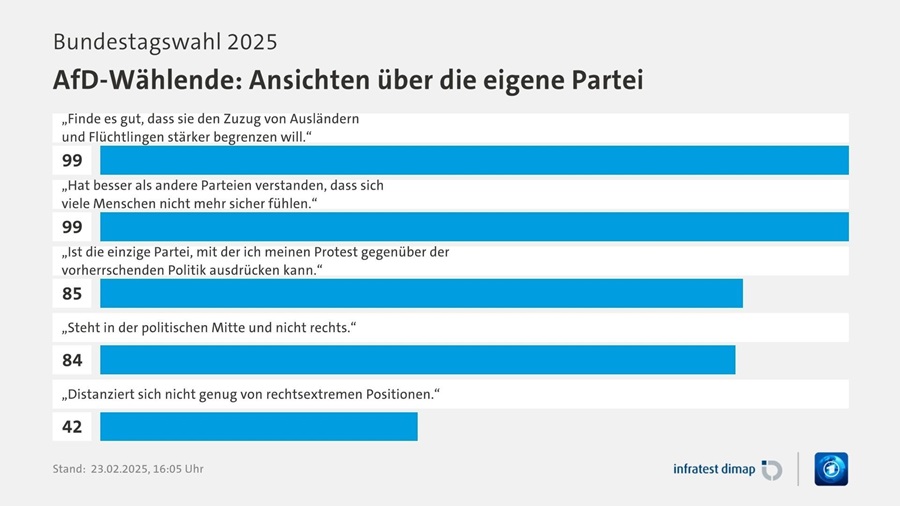 V průzkumu mezi voliči AfD z února 2025 uvedlo 85 % z nich, že AfD je jedinou politickou stranou, jejímž prostřednictvím mohou vyjádřit svůj protest.