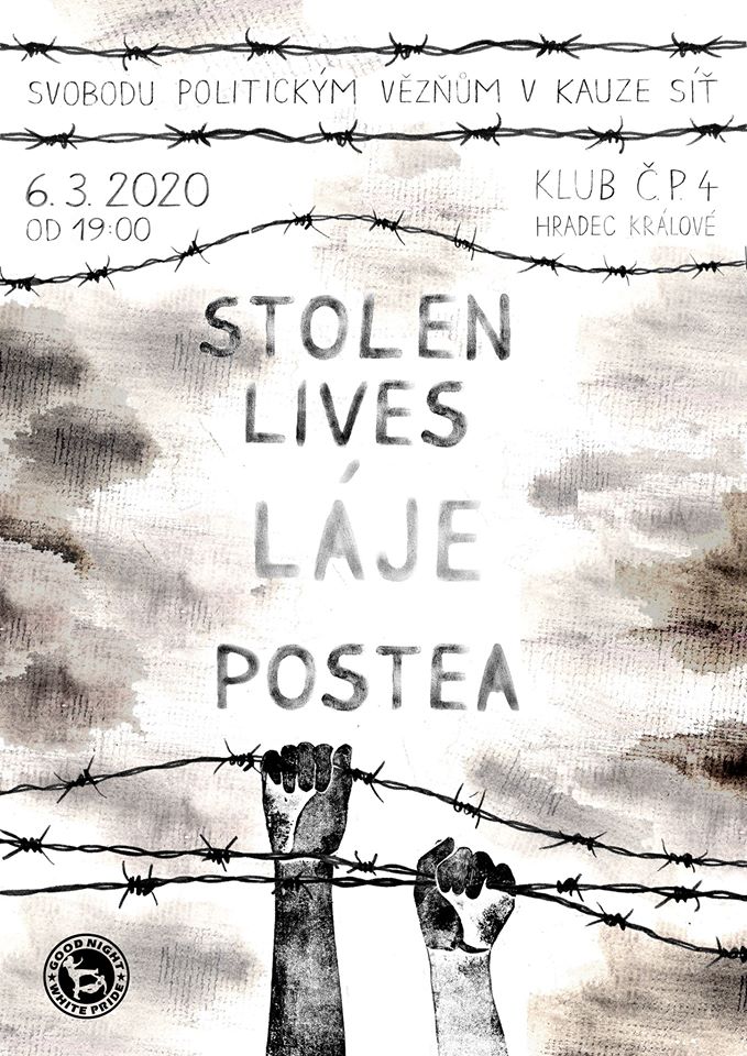 Aby naše podpora neměla jen symbolický charakter, rozhodli jsme se odsouzené podpořit také finančně. AF si vás tedy dovoluje pozvat na benefiční koncert „Svobodu politickým vězňům v kauze Síť“. 6. března od 19.00 vystoupí v hradeckém Klubu č. p. 4 (Velké náměstí 145) kapely Stolen Lives (thrash-grind, Vysoké Mýto), Láje (metal-stoner rock, Jihlava) a Postea (crust-hardcore, Lukavice).