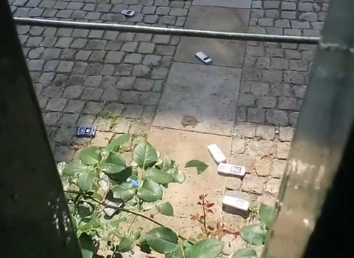 Aktivisté vysypali na dvůr maďarské ambasády desítky telefonů na protest proti špehování novinářů.