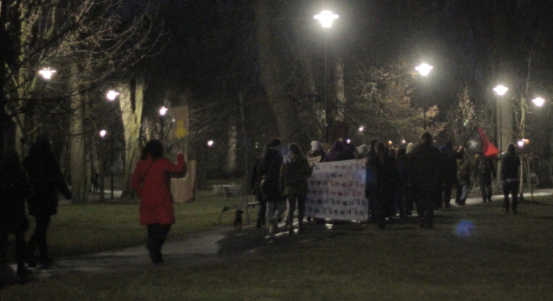Odhadem přišlo 80 lidí, včetně olomoucké buňky AF. Skandovala se protikapitalistická a protipatriarchální hesla, vlála černo-rudá anarchistická vlajka.