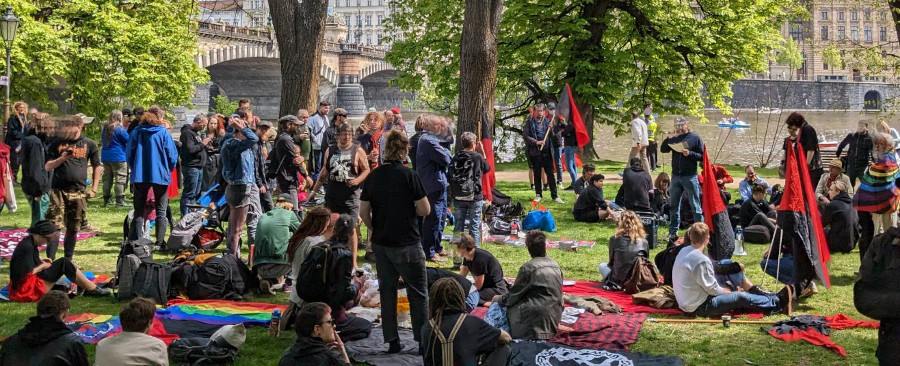 Tady už demonstranty, demonstrantky a další nově příchozí vítalo zasloužené občerstvení. Zatímco se procházelo městem, Food not Bombs Žižkov připravili tortilly plněné robi masem a zeleninou, bramborový bezlepkový guláš, focaccia a ovocné koláče. Kdo nebyl na Střeláku, mohl si i zde pořídit něco z výše uvedených dister. Odpočinek a klábosení zpříjemňovali Djové z kolektivu Vršovice Skins, kterým zpočátku naopak znepříjemňoval produkci vítr. Ale i ten se záhy poddal, a tak se někteří brzy nechali ve skvělé a slunečné atmosféře strhnout i k tanci. Nakrátko hudbu vystřídala druhá série proslovů. První se slova ujal zástupce iniciativy Limity jsme my, aby téma práce zasadil do kontextu boje proti klimatické krizi. V druhém proslovu reagoval člen Anarchistické federace na stále probíhající krvavou snahu Ruska okupovat Ukrajinu. Zdůraznil potřebu naslouchat kamarádkám a kamarádům v místě konfliktu a být aktivně solidární. Tematicky pak navázal další mluvčí, který vzpomenul v boji proti Z-fašismu nedávno padlého ruského anarchistu Dmitrije Petrova a přečetl jeho slova, která napsal pro případ, že by se z bojů nevrátil živý. I když se my tady bavíme, je důležité nezapomínat, že jinde nasazují anarchistky a anarchisté své životy v boji za svobodu.