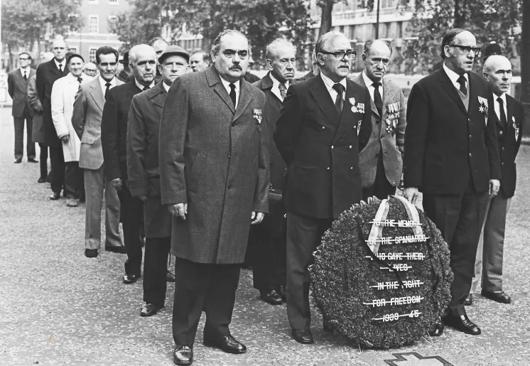 Členové Asociace bývalých španělských vojáků připraveni vyrazit podél Whitehallu v roce 1975. Antonio Vargas Rivas je zcela vpravo, Agustín Roa Ventura je druhý zprava a pátý zprava je Luís Gabriel Portillo (otec Michaela Portilla).