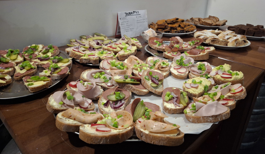 Horní patro AC254 sloužilo k posezení a občerstvení. Na výběr byla spousta chlebíčků s nevajíčkovou a nerybičkovou pomazánkou či veganských sladkých dobrot: štrúdl, brownies, banana bread a dýňový koláč s rybízovým džemem. Kdo si chtěl dát něco teplého, mohl sáhnout po zelňačce.