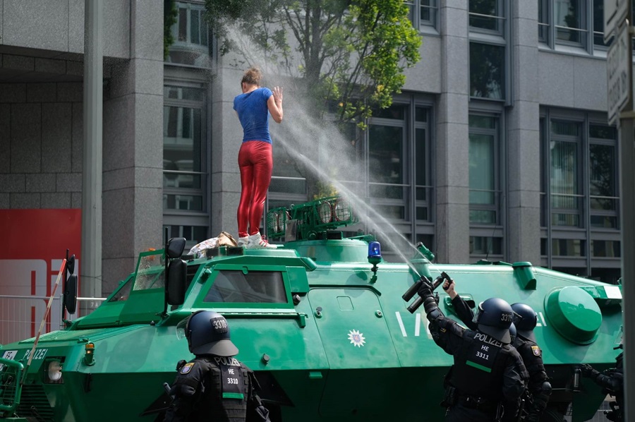 Německé policejní jednotky se pokouší potlačit odpor proti summitu G20 v Hamburku v roce 2017, aby ochránily Donalda Trumpa, Vladimira Putina, Si Ťin-pchinga, Recepa Tayyipa Erdoğana a saudskoarabského ministra financí Muhammada al-Jadaana.