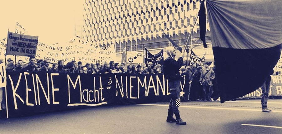 „Žádná moc pro nikoho“: Anarchisté*ky se účastní v roce 1989 největší demonstrace proti režimu NDR. Anarchisté*ky, zejména anarcho-punkeři*ky a ekoaktivisté*ky, hrálx důležitou roli při svržení diktatury.