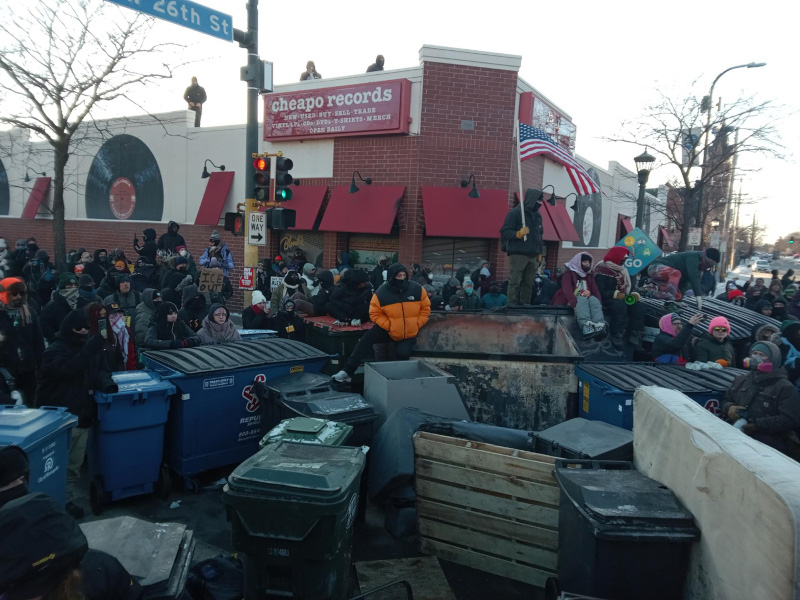 Zdálo se, že všechny malé barikády, které postavilo obyvatelstvo čtvrti Whittier, byly přemístěny sem a blokovaly Nicollet na obou koncích. Lidé seděli na kontejnerech a bubnovali na jejich víka. Dav vypadal v téhle čtvrti rasově rozmanitější než kdy dřív. Uprostřed davu vlála mexická vlajka.