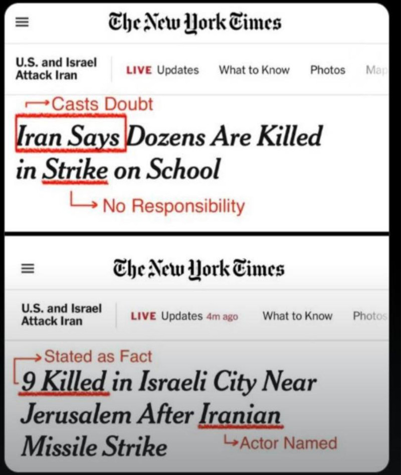 Dvojice screenshotů z New York Times, které se hojně šíří online, to ilustruje s téměř bolestivou jasností. Dva titulky vedle sebe, které pokrývají události ve stejném konfliktu. První informuje, že při útoku na školu zahynuly desítky lidí, ale co je zásadní, Írán „tvrdí“, že se to stalo. Zdroj je přiřazen nepřátelskému státu, tvrzení je drženo na distanc. Poznámka na obrázku tento přístup označuje: „Vzbuzuje pochybnosti“. Slovo „úder“ je podtrženo a označeno jako „bez odpovědnosti“. Druhý titulek informuje o devíti lidech zabitých v izraelském městě po íránském raketovém útoku, což je uvedeno jako fakt a útočník je přímo jmenován. Stejná válka. Stejné noviny. Zcela odlišné standardy uplatňované v závislosti na tom, čí bomby kde dopadly.